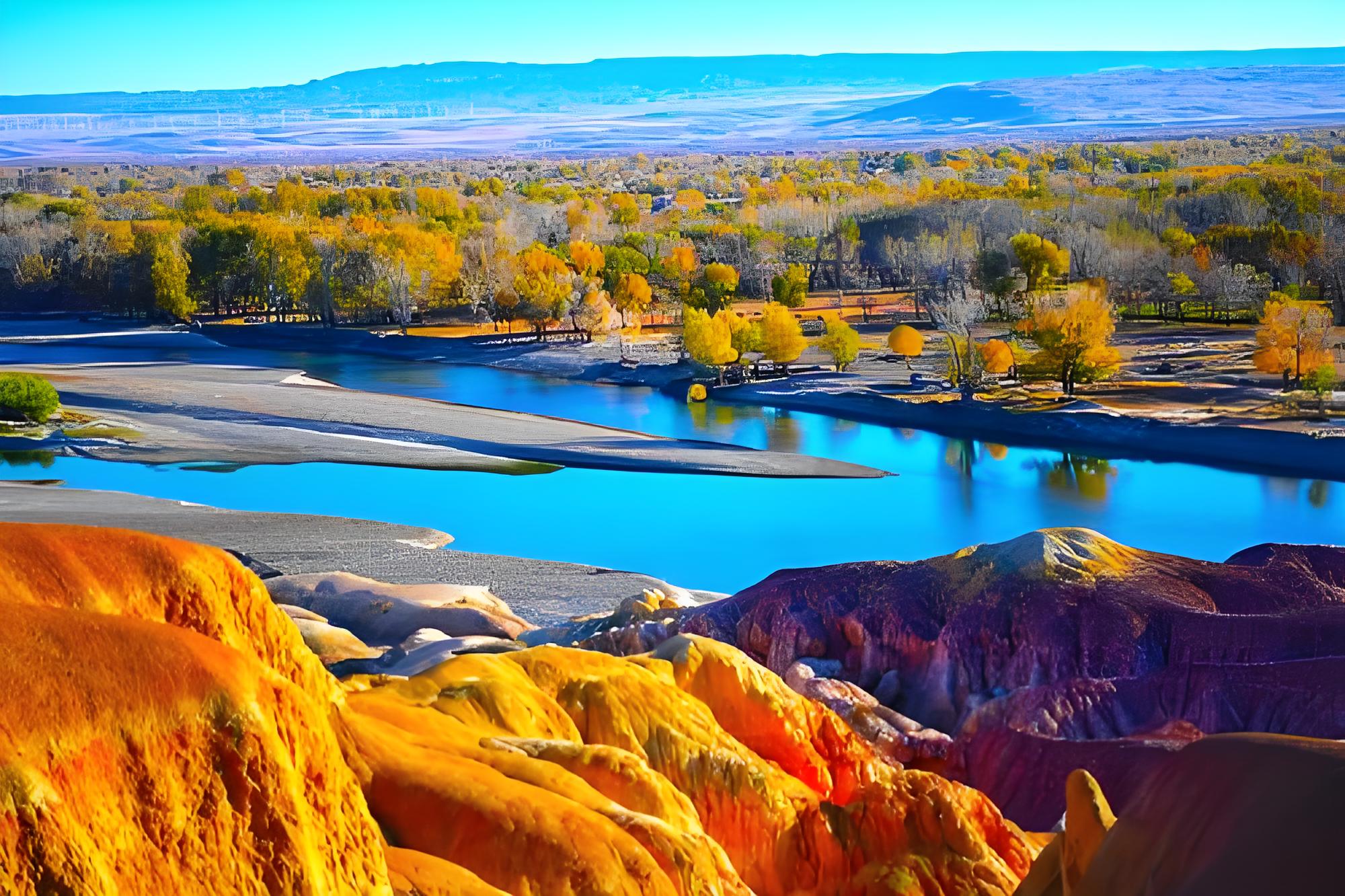 In the morning you can walk to the platform and view the sunrise, and horse riding there is highly recommended. It is safe and the horseman/woman are very kind and nice. This activity only costs 20usd/person about 40mins to 1hour. You also can walk around in the village or the white birch forest. In the afternoon getting back to Burqin and visit the Five-Colored Bay en route. It is actually referring to the banks of a river that has desert, oasis and forest on its south side while sand/rock mounds in all shapes formed by years of wind erosion, line the north bank. The mounds have very irregular profiles and although they are mainly red, bands of red, white, black and yellow are also found in them.
