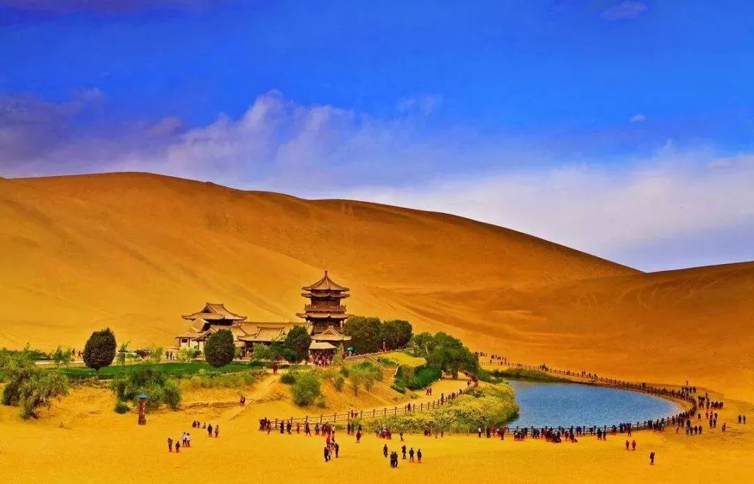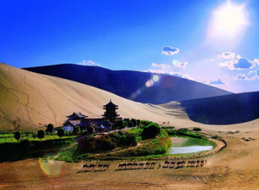 Echoing-Sand Mountain and Crescent Lake:Located 5 km (about three miles) south of Dunhuang City, the Echoing-Sand Mountain, for many Chinese well known as Mingsha Mountain, is celebrated for the sound of the moving sand. In 1994 it was acclaimed as the national key scenic spot. Together with the Crescent Springand the Mogao Caves, the Echoing-Sand Mountain is most popular sitein Dunhuang travel.You may wonder why the sand makes these different sounds. There is a legend that says how, in ancient times, a general with many soldiers came here to fight in a war with their enemies.