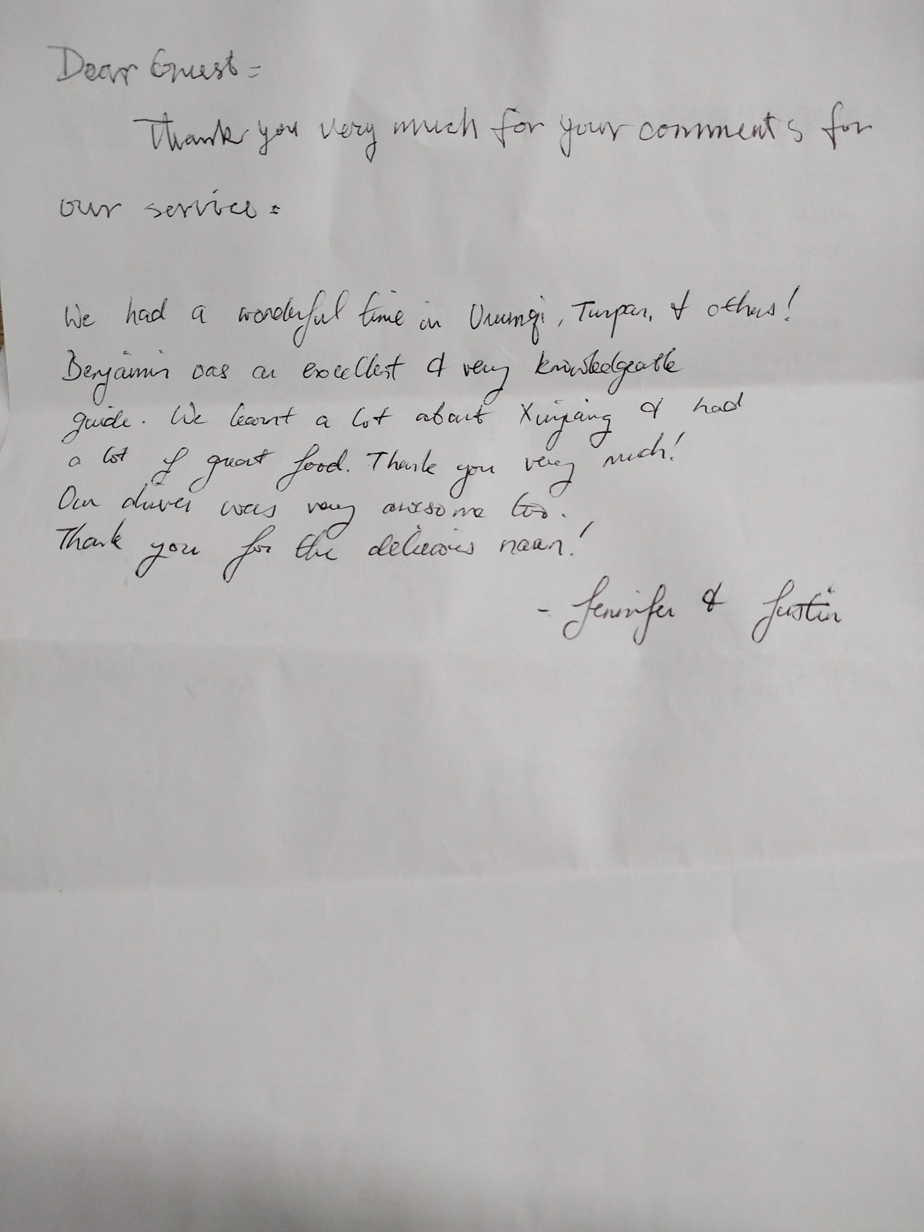 Benjamin was an excellent & very knowledgeable guide. We learnt a lot about Xinjiang & had a lot of good food. Thank you very much!