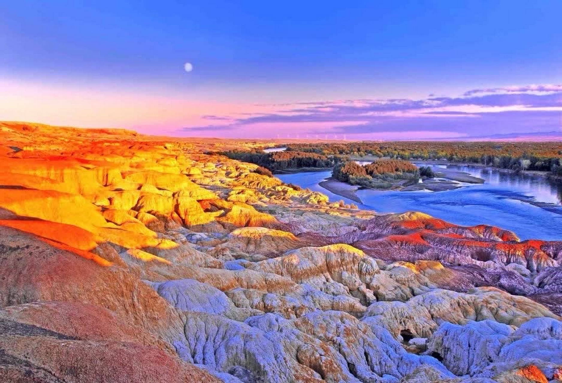 In the morning you can walk to the platform and view the sunrise, and horse riding there is highly recommended. It is safe and the horseman/woman are very kind and nice. This activity only costs 20usd/person about 40mins to 1hour. You also can walk around in the village or the white birch forest. In the afternoon getting back to Burqin and visit the Five-Colored Bay en route. It is actually referring to the banks of a river that has desert, oasis and forest on its south side while sand/rock mounds in all shapes formed by years of wind erosion, line the north bank. The mounds have very irregular profiles and although they are mainly red, bands of red, white, black and yellow are also found in them.