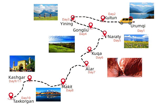 From western Xinjiang to southern Xinjiang. In this 12 days tour, you will not only have an in-depth experience of both of the stunning scenery and interesting custom of Xinjiang, but also the exciting road trip. Stroll around the beautiful lakes and mountains in western Xinjiang and then drive accross the most beautiful highway in China - Duku Highway to run into southern Xinjiang. Taste the flavor of the unique culture and customs of Kashgar and Makit. Then visit the magnificent Pamir Plateau along the Karakoram Highway!